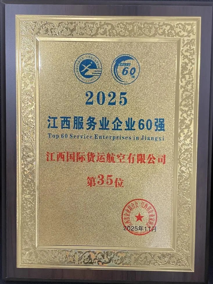 11月21日,江西省企业联合会、江西省企业家协会发布“2025年江西服务业企业60强”榜单,江西国际货运航空有限公司凭借卓越的服务质量及良好市场口碑成功跻身“江西服务业企业60强”第35位,这一荣誉是对江西国际货运航空有限公司企业实力和行业价值的高度认可。